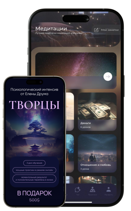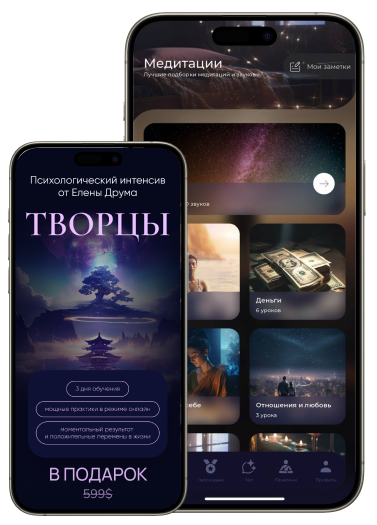 Нет, у вас будет доступ не только к медитациям, но и к психологическим практикам Елены Друма (в том числе, к разделу «Квантовая психология»), которые дают моментальный результат и положительные перемены в жизни. Также вам будут доступны записи закрытых живых эфиров и медитативные, расслабляющие звуки для снятия стресса.